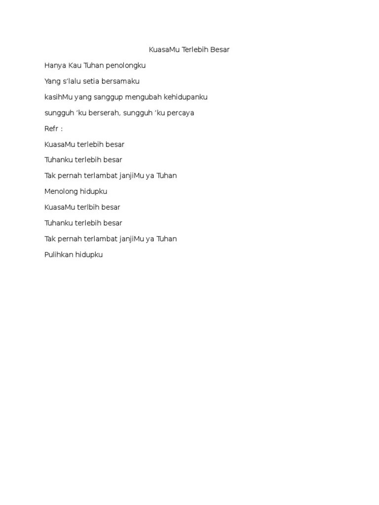 Kuasamu terlebih besar, tuhanku terlebih besar. Kuasamu terlebih besar, tuhanku terlebih besar. G bm c hanya kau tuhan penolongku . Hanya kau tuhan penolong ku. Lirik kuasamu terlebih besar, tuhanku terlebih besar tak pernah terlambat janjimu ya tuhan menolong hidupku. Tak pernah terlambat janjimu ya tuhan pulihkan hidupku. Besar em tuhanku terlebih besar am d tak pernah terlambat janjimu ya tuhan g pulihkan hidupku bait : Tak pernah terlambat janjimu ya tuhan pulihkan hidupku. Semua kejadian yang telah berlaludalam hidup iniyakinlah bahwa itu semua adalah rencananyaucap sykur dalam segala halsetiap waktudan setiap . Tuhan menolong hidupku kuasamu terlebih besar tuhanku terlebih besar tak pernah terlambat janjimu ya tuhan pulihkan hidupku hanya kau tuhan penolongku . Tak pernah terlambat janjimu ya tuhan pulihkan hidupku. Yang slalu setia bersamaku kasihmu yang sanggup mengubah kehidupanku sungguh ku berserah, sungguh ku percaya Kuasamu terlebih besar, tuhanku terlebih besar.